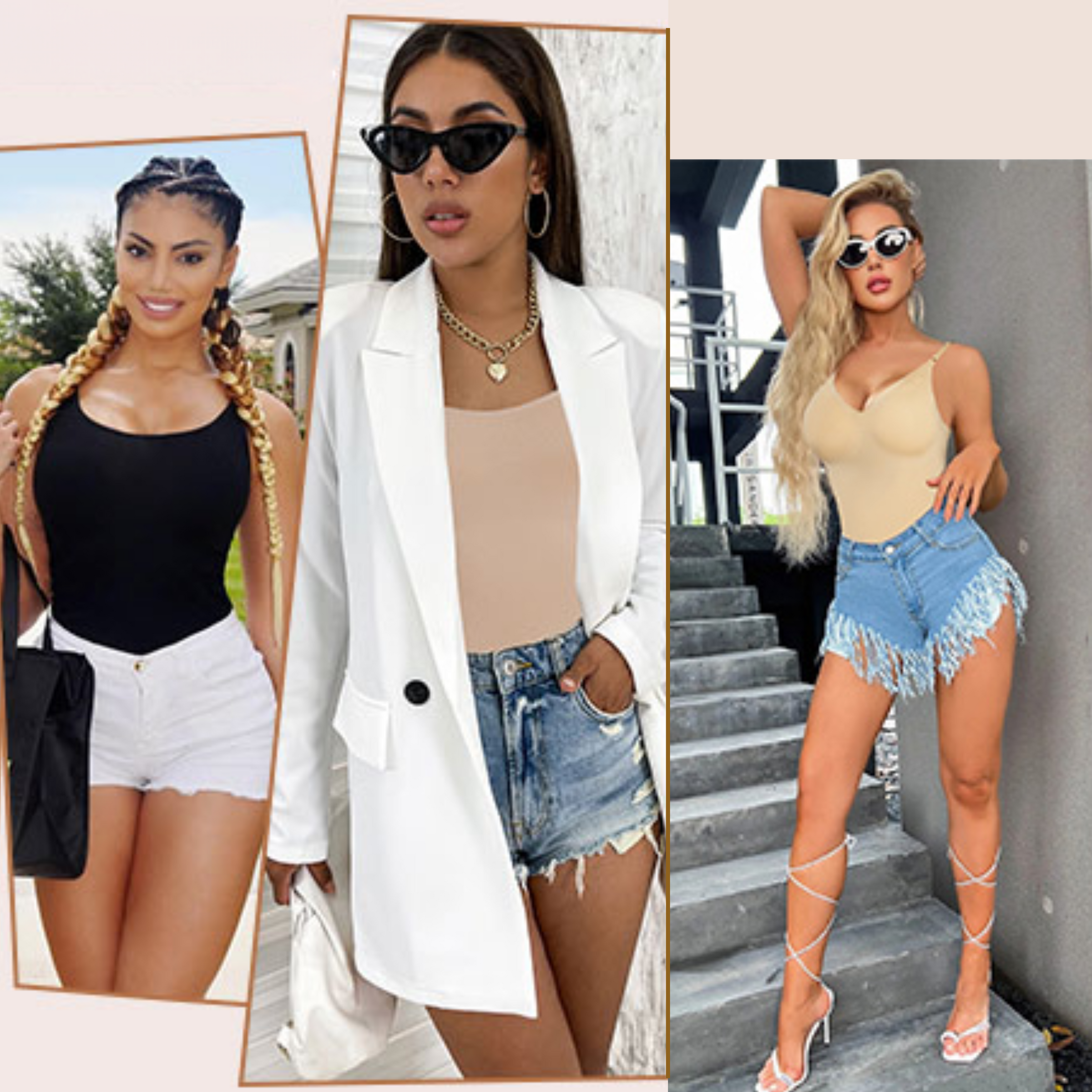 Bei sehr kurzen Shorts empfehlen wir Bodys mit Slip oder Tanga Design, damit der Body unter den Shorts nicht heraus schaut.