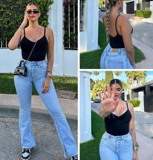 Ein super Alltagsoutfit und sehr Vielseitig. Durch die enganliegende Form eines Bodys wird die natürliche Körperlinie betont, was besonders bei High-Waisted-Jeans vorteilhaft ist. Dies schafft eine ausgewogene und ansprechende Silhouette.
